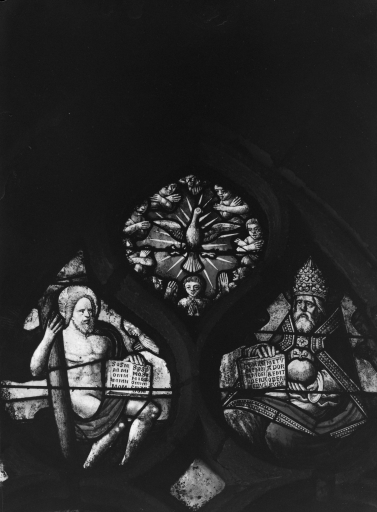 - verre, découpé, peint, polychrome, jaune d'argent, sanguine