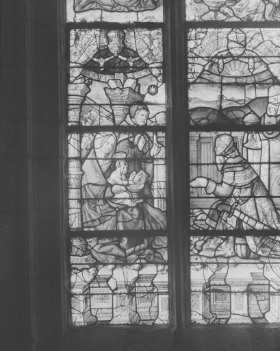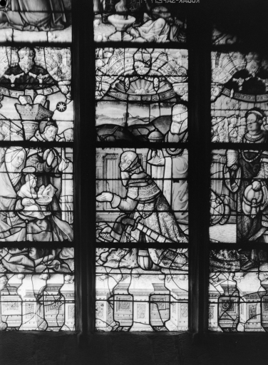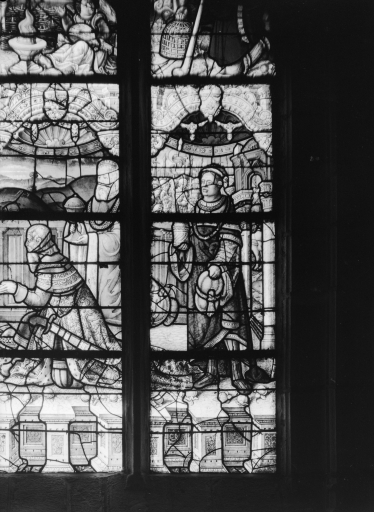 3 lancettes de 6 panneaux, séparées par des barlotières, 2 écoinçons non historiés.