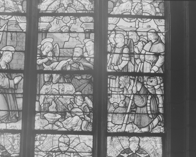 - verre, découpé, peint, polychrome, jaune d'argent, sanguine