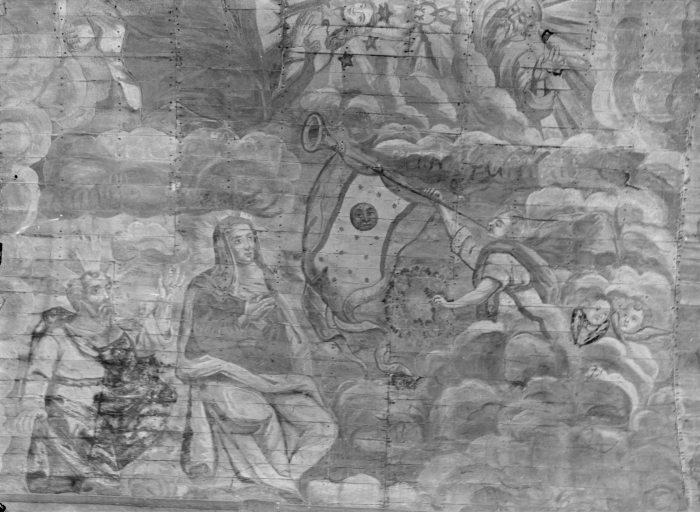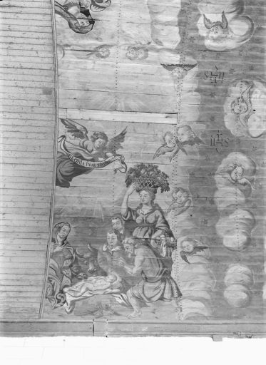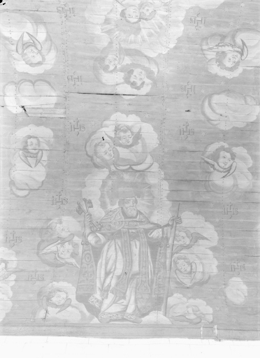Le lambris de la sacristie est conservé dans sa totalité contrairement à celui de la nef en raison de l'effondrement du clocher en 1907.