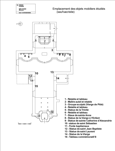 Sur un total de 49 objets ou ensembles d´objets repérés, 21ont été sélectionnés pour étude et traités en dossiers individuels alors que 28, d'un intérêt patrimonial moindre, ont été repérés (voir liste en annexe). L´agrandissement de l´édifice entre 1744 et 1776 entraîne le renouveau des retables du choeur et des transepts dans lesquels on replace des statues plus anciennes. Dans le choeur, on conserve le maître-autel et retable, réalisation remarquable de la seconde moitié du 17e siècle. Des aménagements secondaires interviennent dans la seconde moitié du 19e siècle ; ils entraînent le renouvellement du mobilier religieux monumental, en grande partie réalisé sur place dans l´atelier des menuisiers et ébénistes Pigueller (tribune, stalles, meuble de sacristie, armoire à bannières). La statuaire est complétée par des acquisitions d´oeuvres en plâtre, parfois dons de familles locales comme les Lépineau qui, à la fin du 19e siècle, contribuent également au renouveau des verrières pour lequel la fabrique fait appel au peintre verrier parisien Jean-Baptiste Anglade, également auteur de vitraux religieux au château de Kerlarec appartenant aux Lépineau. Le renouveau des objets du culte est caractérisé par l´acquisition de quelques pièces d´orfèvrerie issues des ateliers parisiens Poussielgue-Rusand et Demarquet. Aujourd´hui, les retables placés dans les bras du transept sont en mauvais état et ont perdu leurs autels respectifs. Une partie du mobilier monumental (vestiges d´un chemin de croix, de stalles, de lambris et peut-être d´autels) ainsi qu´une statue de qualité (apôtre ou saint Pierre), sont relégués dans l´entrepôt municipal.