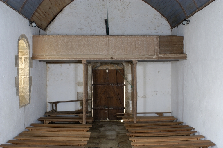 Le mobilier ancien de l´édifice qui date, pour l´essentiel du 16e siècle, a en grande partie disparu. Parmi les cinq objets repérés, deux statues ont été traitées dans un dossier individuel. En 1892, l´enquête sur les chapelles du diocèse de Quimper fait état de quatre statues dont celles de saint Julien, en plâtre, toujours en place, ainsi que de trois autres statues dont une Notre-Dame de Lourdes, disparue. La maîtresse vitre figurant saint Eloi et saint Méen a été fabriquée à la fin du 19e siècle dans l´atelier du Carmel du Mans d´après un carton du peintre verrier Hucher. Les statues de saint Eloi et de saint Julien, oeuvres de série en plâtre peint, sont contemporaines, tout comme la tribune dont l´escalier d´accès a été supprimé.