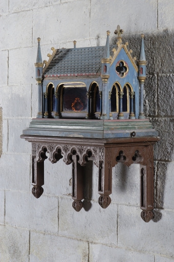 Les reliquaires en forme de chapelle sont placés sur des supports en bois accrochés aux murs du choeur et de la nef. Les reliquaires 1 et 2, vitrés, forment une paire. Les reliquaires 3 et 4, polychromes, forment une paire.