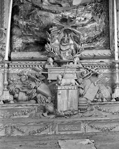 Autel-tombeau posé sur un emmarchement de trois marches, deux gradins, tabernacle de forme complexe, retable avec contretable enfermant un tableau ruiné, contretable limitée par des pilastres.