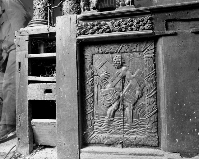 Partie supérieure figurant la Nativité, l´Adoration des Mages et la Présentation au temple. Partie centrale supérieure surmontée des statues de la Prudence et de la Tempérance. Parties médianes à claire-voie avec colonnettes encadrant les statues de la Justice (sud) et l´Espérance (nord). Sur la partie inférieure, panneaux sculptés des deux côtés figurant des scènes bibliques ou de l´Antiquité. Côté ouest : quatre des douze travaux d´Hercule (l´hydre de Lerne, le lion de Némée, nettoyage des écuries d'Augias, meurtre de Geryon). Côté est : Mercure, la légende de Jonas (Jonas jeté à la mer et Jonas rejeté par la baleine sur le rivage de Ninive, Diane chasseresse, le sacrifice d´Abraham.