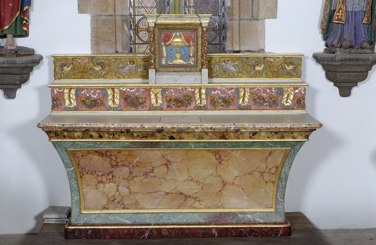 Autel en forme de tombeau. Retable à deux gradins avec tabernacle central.