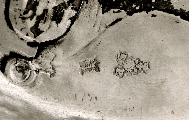 Poinçon de maître (sous la fausse coupe et sur la patène) : initiales S et P, un soleil au centre, une fleur de lys flanquée de 2 grains de remède et surmontée d' une couronne ouverte. Poinçon de charge (sous la fausse coupe et sur la patène) : A couronné (gros ouvrages d' argent, Paris, 1783-1789).