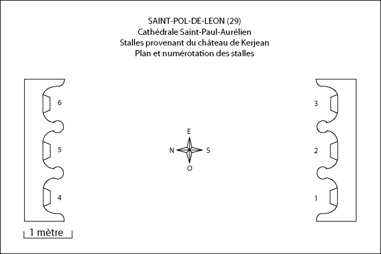 La cathédrale de Saint-Pol-de-Léon abrite deux ensembles de stalles aujourd´hui bien différenciés. On a cru, en effet, pendant longtemps, que les six stalles se trouvant au fond du choeur appartenaient à l´ensemble de soixante-six stalles toujours conservé à Saint-Pol et qu´il s´agissait des stalles en retour supprimées au milieu du XIXe siècle, lors de travaux de réaménagement du choeur.