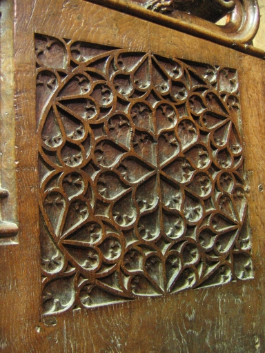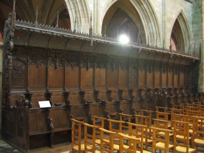 - Les dessins paraissant gratuits sont rares, svastika (stalle 48) ou potence qui ignorent le fait religieux. Plus nombreux sont les monogrammes liturgiques. Mais la masse des inscriptions est constituée par des noms propres de personnes. Entièrement énoncés, ou réduits à des initiales, ils montrent la volonté de marquer une place au sein d´une hiérarchie qui ne touche d´ailleurs directement aucun de ces dignitaires ecclésiastiques, les chanoines installés dans les hautes rangées.