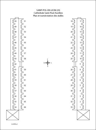 - En 1631, dans la stalle 60 qu´il occupait, un des enfants de cette psallette disparue, François Morvan, sans doute tancé par quelques chanoines, n´a guère eu le loisir de finir un second graffito qu´il avait déjà esquissé quand il occupait la stalle voisine plus basse. Sans son condisciple, Alain Simon, nous n´aurions jamais su ce qu´il avait voulu dire en gravant ces simples mots : enfant de Heureusement, quatre ans plus tard, Alain est plus heureux. Il déploie sur le dossier 62 une belle inscription de quatre lignes : Alain Simon : enfant : de : la psallette : a : Sct : Paul : De : Léon : faict : Ian : 1635. Par esprit d´imitation, sans doute, ce dernier suit l´exemple d´Alain Le Borgne, recteur de Saint-Jean, l´une des sept paroisses du Minihy et de Mathieu Simon, autre recteur, qui occupent le siège voisin 60. Alain Simon, d´ailleurs, ne se sent-il pas prédestiné. On le retrouve choriste-clerc, neuf ans plus tard, avec Thomas Le Maigre (stalle 62), dans la liste des desservants de la cathédrale.