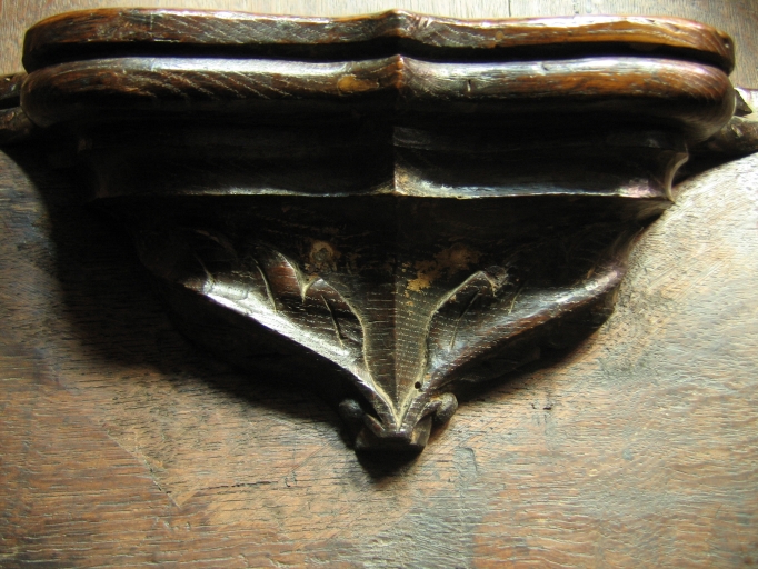 Sur la miséricorde : deux feuilles dentelées s'écartent pour soutenir une console présentant quatre moulures.