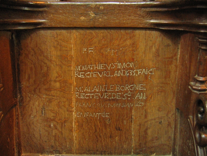 Une croix, les monogrammes "P F", "M" ; "M : MATTHIEU : SIMON : RECTEUR : LAN : 1635 : FAICT" ; "M : ALAIN : LE : BORGNE : RECTEUR : DE : SCT : AN" ; "FRANCOIS : MORVAN : 1639 : ENFANT DE ".