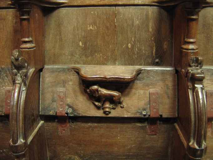 Sur la miséricorde : un grand chien est représenté de profil, tourné vers la gauche. Il tient dans sa gueule un os et on distingue un autre os, dont l'extrémité est cassée, entre ses pattes antérieures. La physionomie de l'animal le classe parmi les "mâtins", c'est-à-dire des chiens massifs, aux longues oreilles tombantes et au corps et aux pattes puissantes.