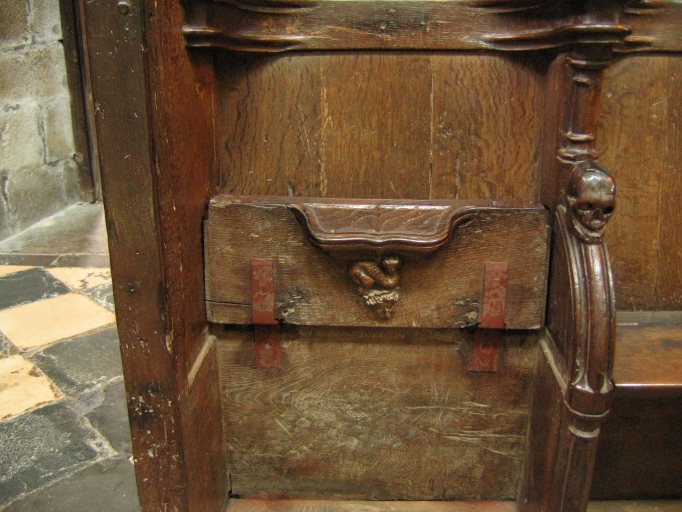 Sur la miséricorde : une petite tête d'homme est surmontée d'un hybride à tête de femme. L'homme porte un chapeau à la mode et tire la langue tout en souriant. Le monstre sur sa tête, très grand en proportion, possède un corps à deux pattes et un long cou au bout duquel est posé une petite tête féminine délicate. Celle-ci porte un chapeau lui aussi à la mode et semble regarder l'homme.