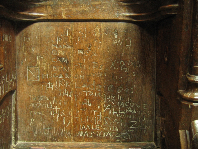 Beaucoup de graffiti sur cette stalle dont : "X : P" ; "IHS" ; "IAN" ; "HAMON" ; "CAM" ; "BON" ; "M. GARCON (?)" ; "UVH" ; "TANGUY" ; "IACQUES" ; "IAN LE MASSON" ; "ALLA (?)" ; "ABBOVILLE" ; "MA". Sur la parclose gauche : "ALAIN LEROY" ; "ALAIN : LR" ; "SULE".