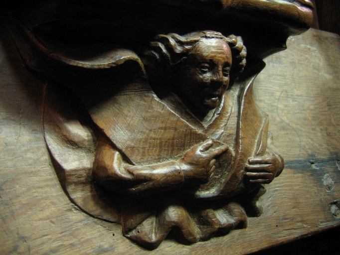 Sur la miséricorde : un ange, représenté de face à partir de la taille, tient un rouleau devant lui. Ce rouleau forme un V dont la pointe est située au niveau de l'abdomen du personnage. Il n'y a pas d'inscription sur ce rouleau. L'ange le tient de la main gauche et le pointe de l'index droit. Il est vêtu d'une tunique à manches longues, au col large en V et aux plis ondulants. Son visage n'exprime aucune expression en particulier. Son nez est large, les yeux mi-clos et il semble froncer des sourcils. Le philtrum, entre le nez et la bouche, est particulièrement large. Ses cheveux forment une auréole de mèches ondulantes autour de son visage.