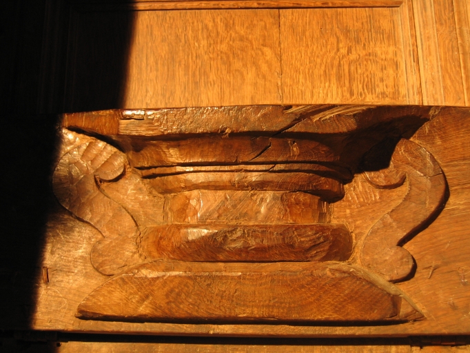 - chêne, taillé, mouluré, ciré, décor en bas-relief, décor en demi-relief