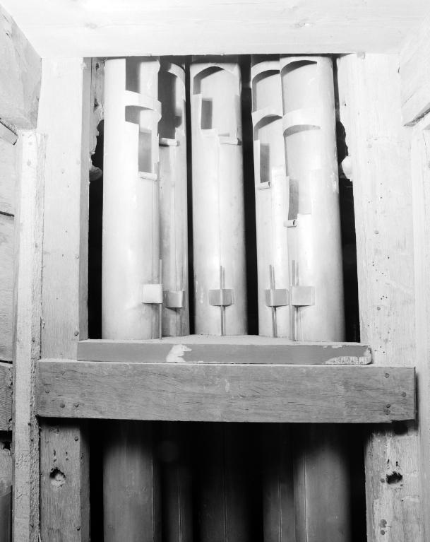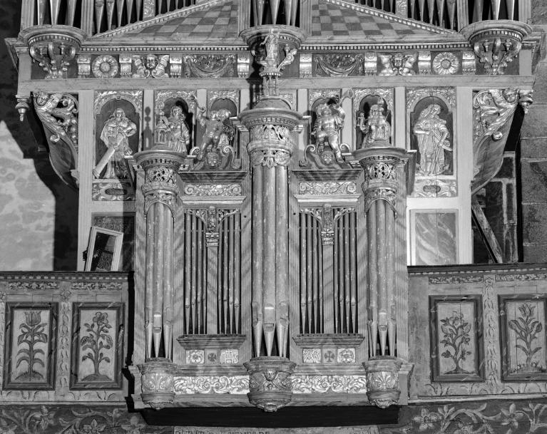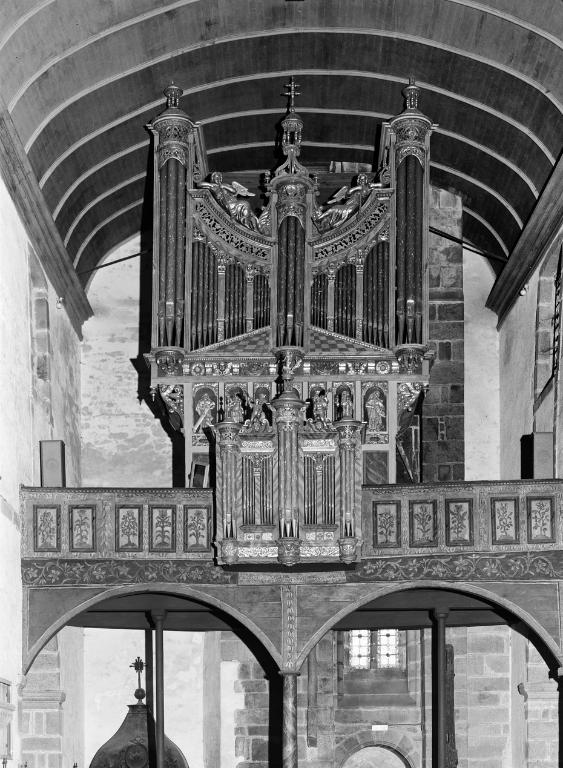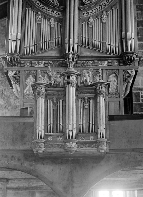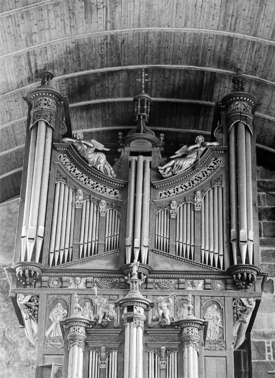 L’orgue installé au revers de la façade occidentale de l'église se compose d'un buffet principal et d'un positif accroché au devant de la tribune. Le meuble principal présente trois tourelles qui déterminent deux travées de tuyaux, elles-mêmes divisées en trois par des arcatures en plein cintre. Le positif reprend en réduction le même principe. La partie inférieure du buffet principal est ornée de sept panneaux en bas reliefs représentant les Vertus encadrant les figures de saint Hervé, sainte Cécile et saint Yves. Le sommet de l'orgue, en arc plein cintre inversé, supporte deux grandes figures d'anges sonnant de la trompette.