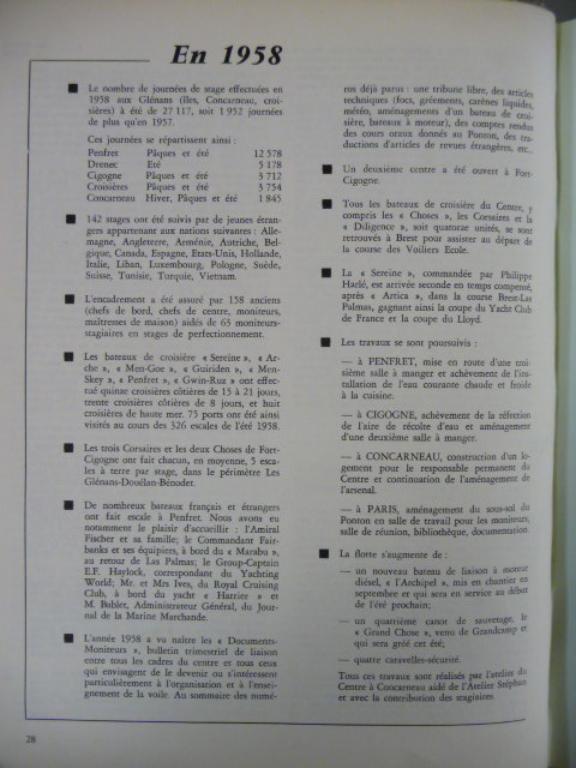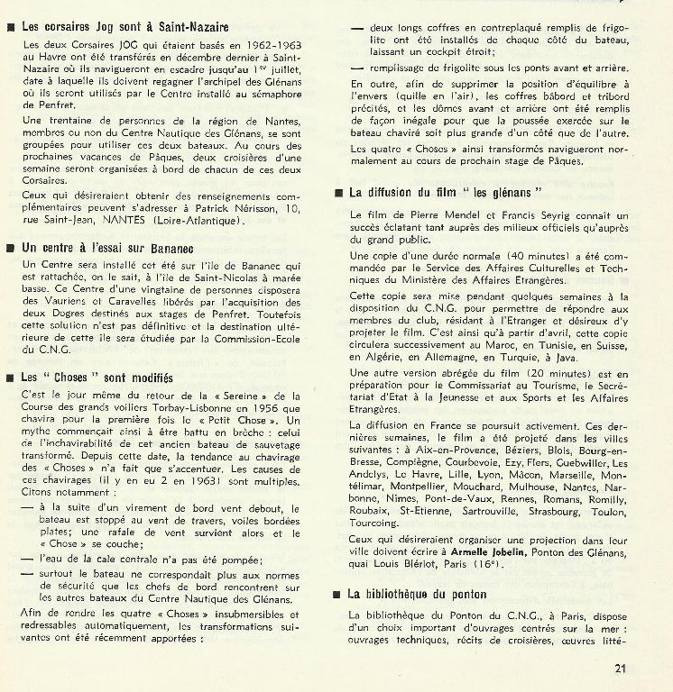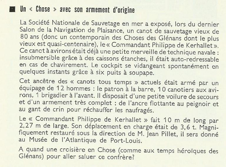 Dates d’arrivée des Choses aux Glénans : 1951 - Le Petit Chose (Ex Eline et Sophie) de la station du Cap Lévi (N° 43) - 1956 - Le Flying Chose ( Ex Benoît Champy) de la station de Cayeux (N° série 79) - 1958 - Le Grand Chose (Ex Commandant Garreau) de la station de Grandcamp (N° série 61) - 1958 - Le Marie Chose (Ex Gabiou Charron) N° 1 de la station La Cotinière, île d’Oléron. A la même période, l’école de voile acquiert un autre ancien canot de sauvetage de la station de Lesconil lancé en 1911, l’Amiral de Maigret. Issu d’une série de canots postérieure construite par les chantiers Augustin Normand, il est plus court (9m80) et plus large (2m60) que les Choses. Gréé en goélette et motorisé (25 CV), et rebaptisé la Diligence, il sert de bateau de liaison entre Concarneau et les îles, jusqu’en 1960.