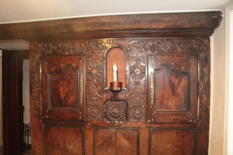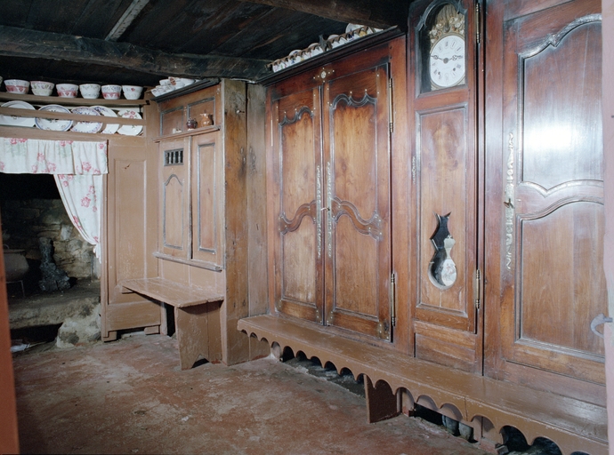 Comme dans une grande partie de la Cornouaille, le mur nord de la pièce, aveugle, accueillait le « front des armoires ». Il s’agissait d’un alignement d’armoires, quelque fois un buffet vaisselier ou une horloge, qui accompagnaient un lit-clos (ou demi-clos) situé contre la cheminée : le gwele tal an tan (le lit-clos près du feu). Pour une meilleure cohérence de l’ensemble, les meubles qui le composaient étaient généralement surmontés d’une corniche moulurée sur laquelle on avait disposé une rangée de bols multicolores.