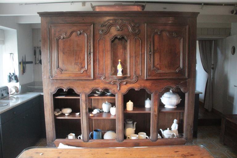 Ce dernier était installé contre la cloison qui séparait la salle commune du couloir central de la maison. Sa façade dont les portes coulissaient latéralement sur des glissières pour accéder à la paillasse était positionnée en face de la table et constituait la seule partie du meuble ouvragée et décorée.
