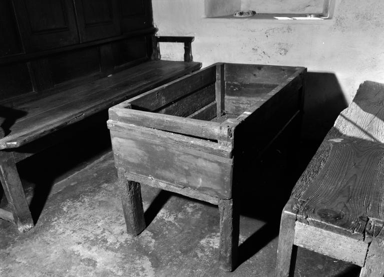 Les pieds disgracieux des meubles étaient cachés par un petit banc qui courrait tout le long de l’alignement. Ce banc propre au Cap-Sizun est dit « bank koste’n ti » (le banc du côté de la maison), bank ar arbeliou (le banc des armoires) ou encore « banc des pauvres » car c’est ici que s’asseyaient, selon plusieurs témoignages, les mendiants invités à partager le repas de la famille.
