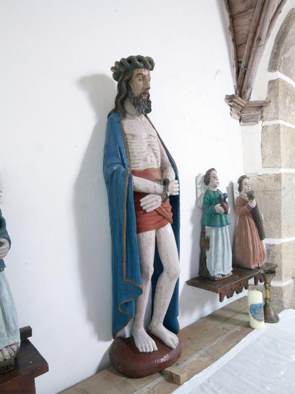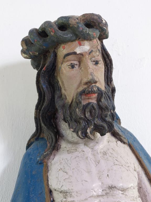 Le Christ est debout. Il porte perizonium rouge et un manteau pourpre de couleur bleue. Ses côtes sont visibles. Son corps est squelettique.