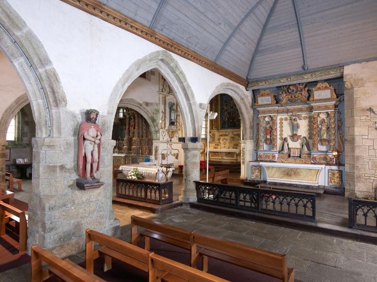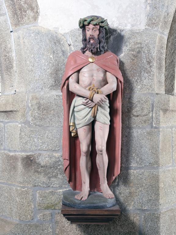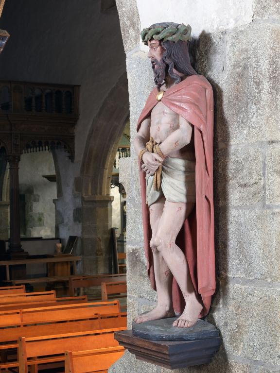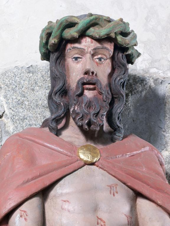 Comme la statue est placée en hauteur, cela peut permettre une interaction avec le fidèle. L’arcade sourcilière outrée donne une certaine intensité au regard.