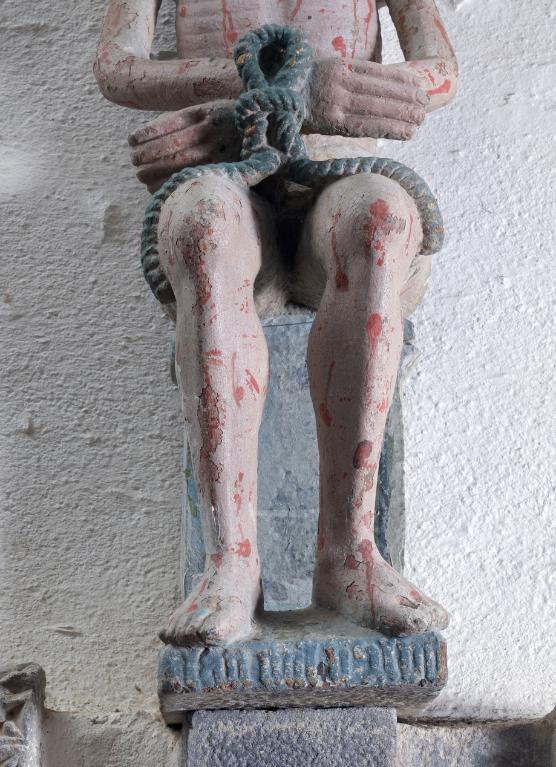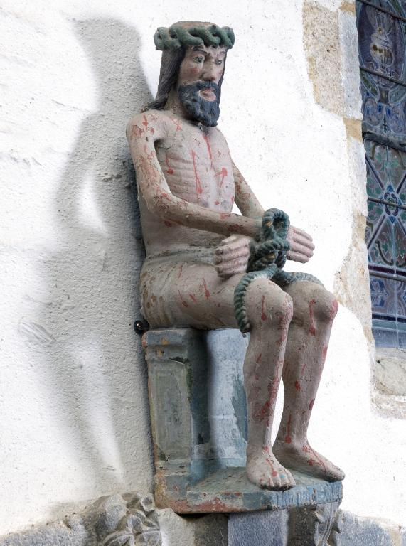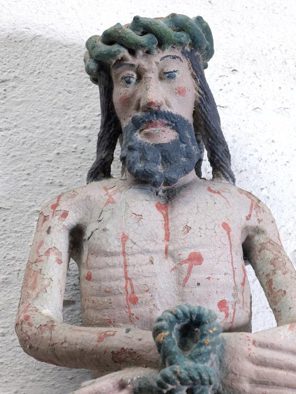 Le Christ est assis sur un support. Son corps est couvert de blessures rouges et sanguinolentes.