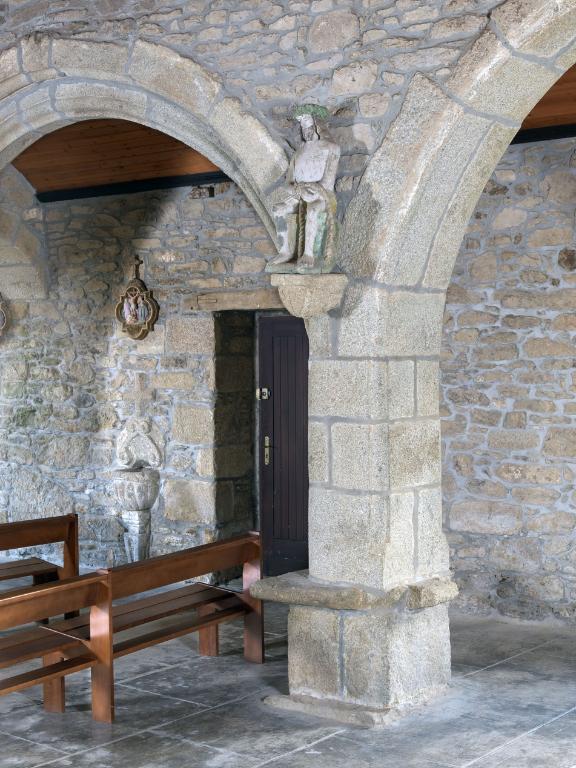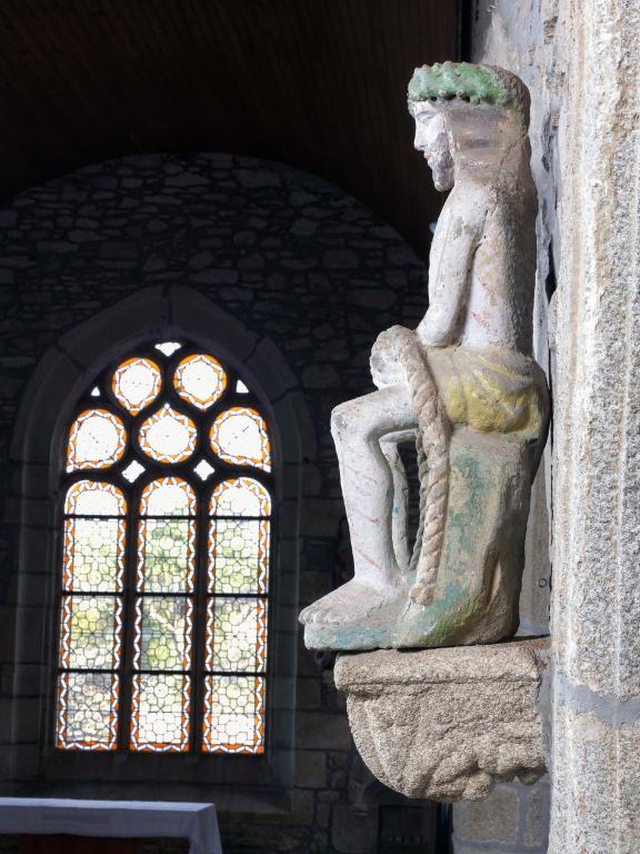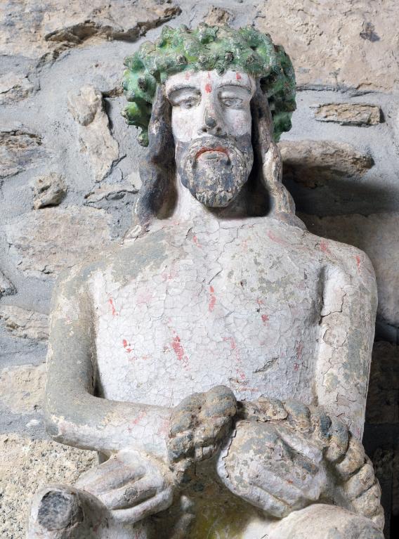 Le Christ est assis sur un support vers. Il porte un perizonium jaune. Son corps est couvert de blessures rouges qui sont des stigmates de la Flagellation.