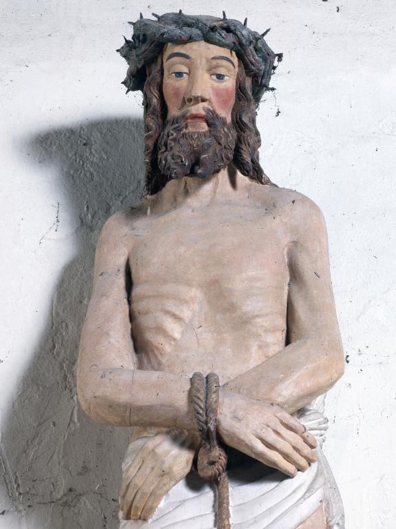 Le Christ est debout. Il ne porte que le perizonium. Son corps est maigre : on peut compter ses côtes et distinguer les os de ses jambes.