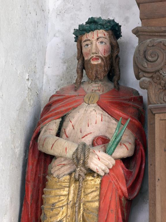 Le Christ est debout. Il porte un perizonium doré et le manteau pourpre attaché au milieu du torse. Le drapé du manteau est mis en valeur par la posture du Christ qui le maintient sous son bras gauche. Son corps est couvert de blessures sanguinolentes, stigmates de la Flagellation.