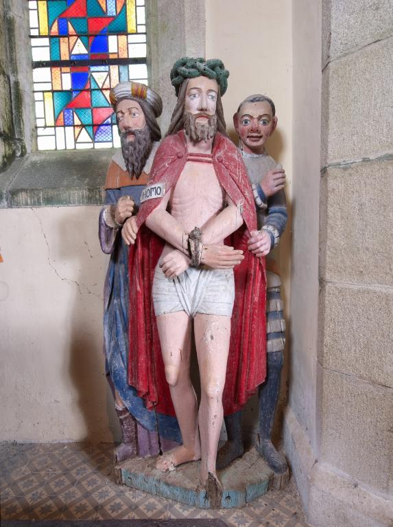 Le Christ est encadré par deux personnages : Pilate à gauche et un bourreau à droite vêtu d’un costume à crevés et d’une culotte bouffante.