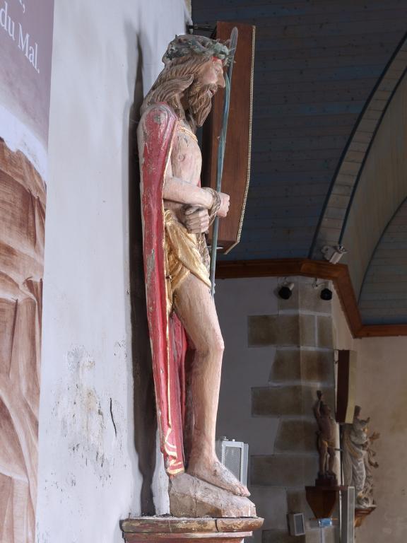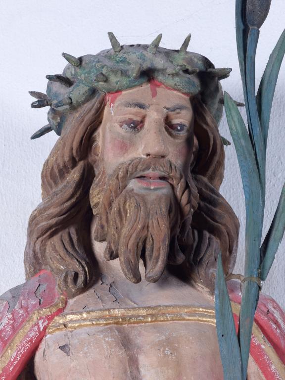 Il porte une couronne aux épines saillantes qui le font saigner au niveau du front. Ses cheveux et sa barbe sont bouclés. Sa bouche est entrouverte. Ses yeux sont ouverts, son regard est dirigé vers le sol.