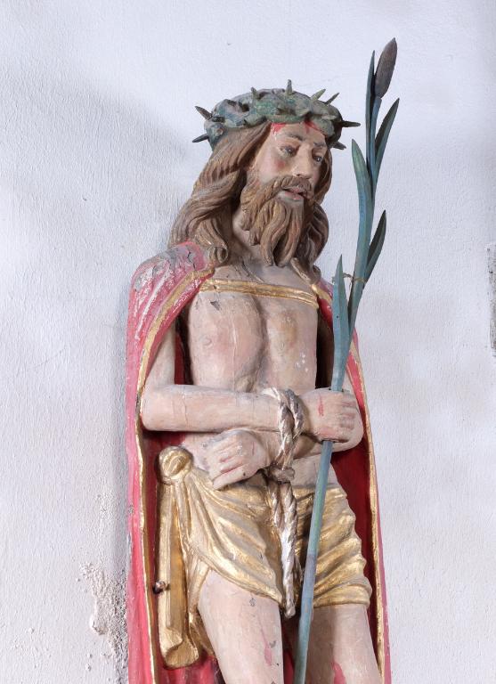 Le Christ est debout. Il revêt un perizonium doré et le manteau pourpre. Il a quelques blessures sanglantes sur le corps.
