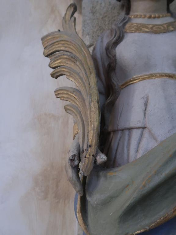 Sainte Catherine d'Alexandrie est représentée debout tenant dans sa main droite une palme (rapportée) et retenant un pan du manteau à senestre. A ses pieds du même côté est disposée une roue dentée en référence à son supplice.