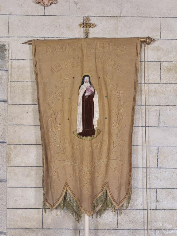 La bannière représente sur l'avers une Vierge à l'Enfant, identifiée par l'inscription à Notre-Dame du Crann sans reprendre les caractéristiques formelles de la statue ainsi nommée et conservée dans la chapelle du même nom (IM29005748). Il s'agit sans doute d'un sujet en série, de même que la figure de sainte Thérèse représentée sur le revers. Seule l'inscription personnalise la bannière.