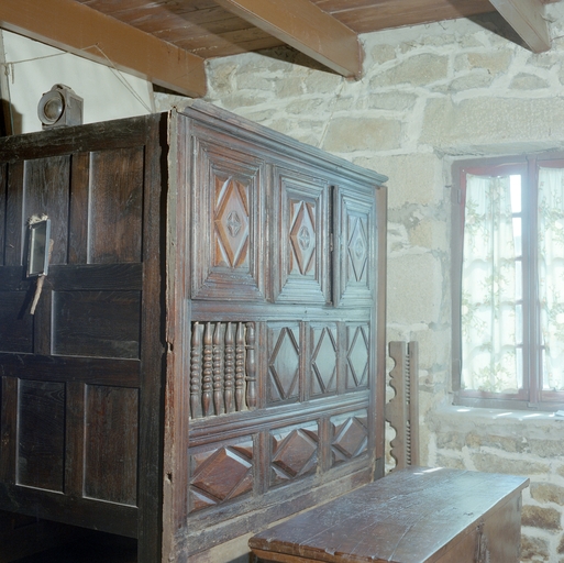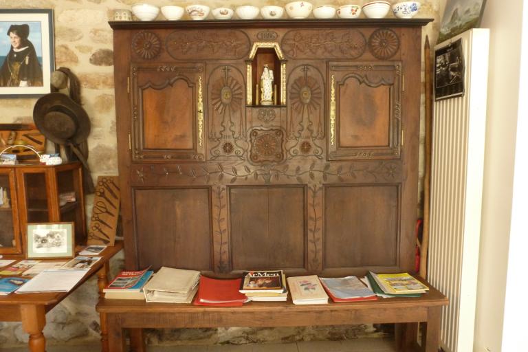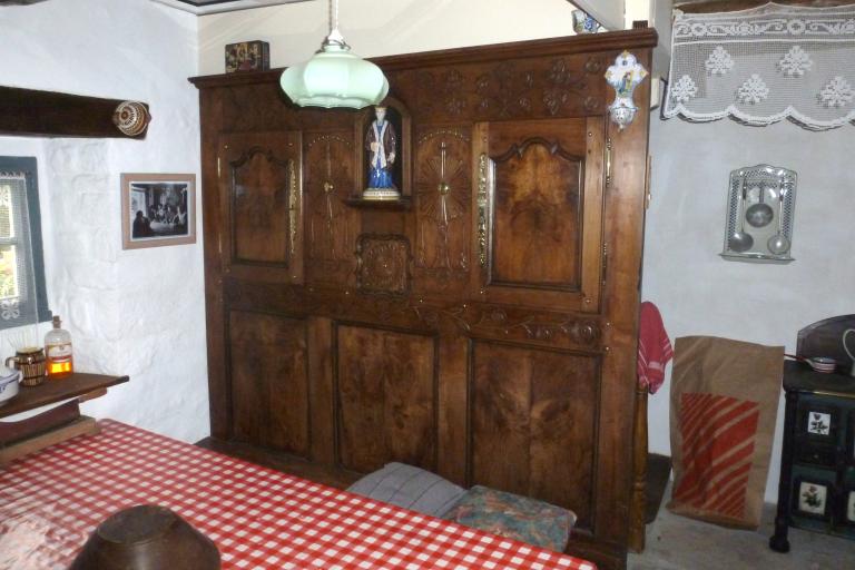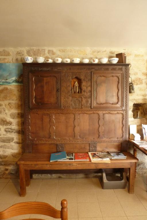 Evolution locale du banc dossier breton ou cloison de bois utilitaire et symbolique, ce meuble n’existe que dans le Cap-Sizun, plus particulièrement dans l’ouest de la presqu’ile. Il était placé perpendiculairement au mur sud de la salle commune, en face du lit clos de l’autre côté de la table. Son dossier a été agrandit à un tel point qu’il est devenu une véritable cloison et dissimulait l’arrière-cuisine aux yeux des visiteurs.