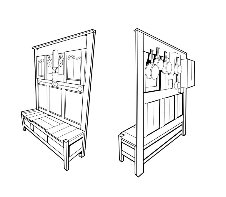 L’envers du meuble était également destiné au rangement : On s’en servait pour y suspendre les ustensiles de cuisine au-dessus de la table généralement en pierre où l’on préparait le repas.