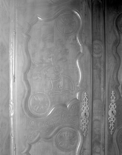 Panneaux latéraux en châtaignier ; assemblages du bâti à coupe droite, des battants à coupe mixte ; corniche chantournée ; fiches à vase à lacets en fer, fût à pans, entrées de serrure en fer découpé symétriques.