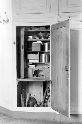 Meuble garnissant les quatre murs de la sacristie ; lambris recouvrant les embrasures des fenêtres ; une table comporte deux séries de 7 tiroirs larges et plats séparés par des tiroirs carrés ; 20 placards à hauts battants étroits ; l'un des placards com.