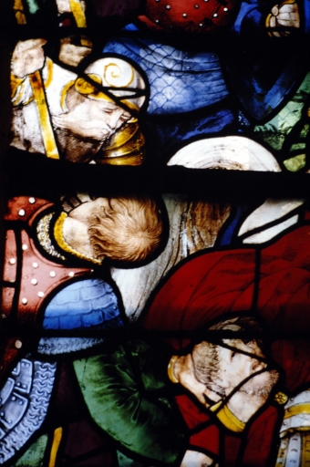 Sujet : cette verrière a longtemps passé pour représenter du Guesclin marié à Jeanne de Laval détentrice du château de Montmuran sur la commune des Iffs.