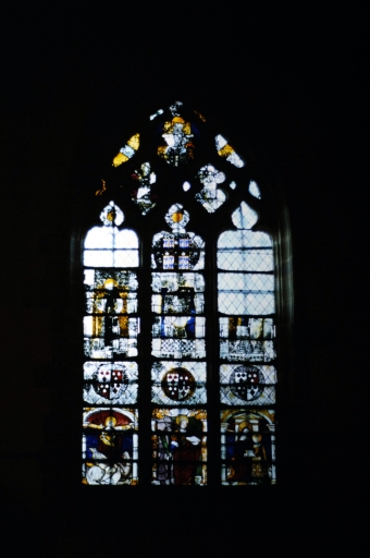 Sur le registre inférieur : MVXXXVI M. G. DENOUAL ET GUION DU CHESNE TRESORIERS FIRENT FAIRE CESTE VITRE ; armoiries identifiées des Montmorency Laval au dessus de saint Jean-Baptiste, au dessus du registre inférieur armoiries.