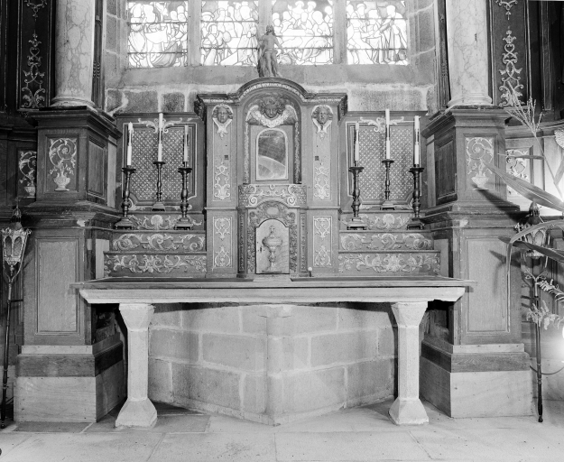Retable architecturé de plan concave sur soubassement encadrant la maîtresse-vitre et orné de 2 figures en ronde bosse ; table d'autel en pierre de taille en granite appareillée sur deux pieds et un massif postérieur triangulaire ; devant d'autel en bois.