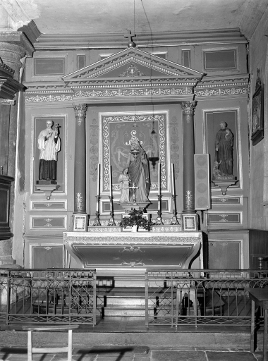 Autel à élévation galbée ; retable à ailes et avant-corps central formé de 2 colonnes surmonté du fronton triangulaire.
