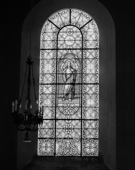 Verrières (2) (verrière à personnages) : Sacré Coeur, Immaculée Conception (baies 3, 4), église paroissiale Saint-Ouen (La Chapelle-Erbrée),