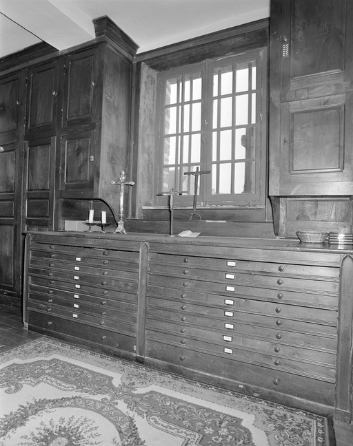 Chasublier composé de 2 travées de 8 tiroirs et un faux tiroir inférieur ; assemblage du bâti à coupe droite, chevillé ; moulures à coupe d'onglet rapportées.