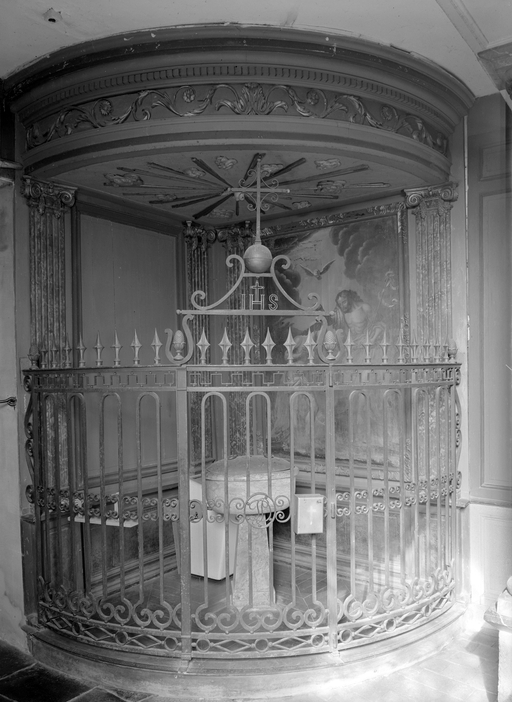 Le baldaquin de bois, soutenu par 4 pilastres cannelés, abrite des fonts baptismaux de marbre. La clôture qui ferme l'encoignure est en fer forgé.