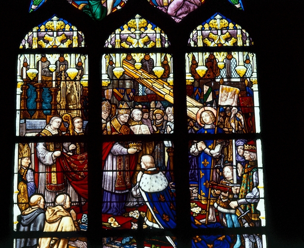 Baie 5 : 3 lancettes divisées par 2 meneaux et 2 barlottières en 6 panneaux rectangulaires et 3 panneaux trilobés ; jour de réseau à 4 soufflets et 3 mouchettes. Baies 4, 7, 9, 11, 13, 16 : 2 lancettes divisées par un meneau et 2 ou 3 barlottières en 4 ou 6 panneaux rectangulaires et 2 panneaux trilobés ; jour de réseau à 1 ou 2 mouchettes et 4 ou 2 soufflets. Baies 15, 18 et 100 à une lancette avec armatures métalliques. Jaune d'argent dans les baies 4 et 7. Email sur verre dans les baies 5, 13 et 15. Verres imprimés dans les baies 13 et 15. La baie 15 encadre une verrière ex-voto.