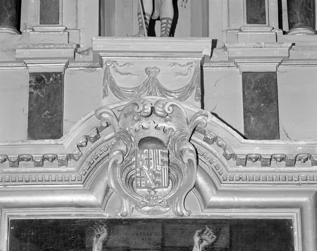 Armoiries au-dessus du tableau : armes d'alliance des familles Laval-Montmorency et La Trémoille (couronne de marquis ; supports : palmes). Inscription à droite de la travée droite : HENRI . DUC . DE LA TREMOILLE PAIR . DE . FRANCE . 1646.